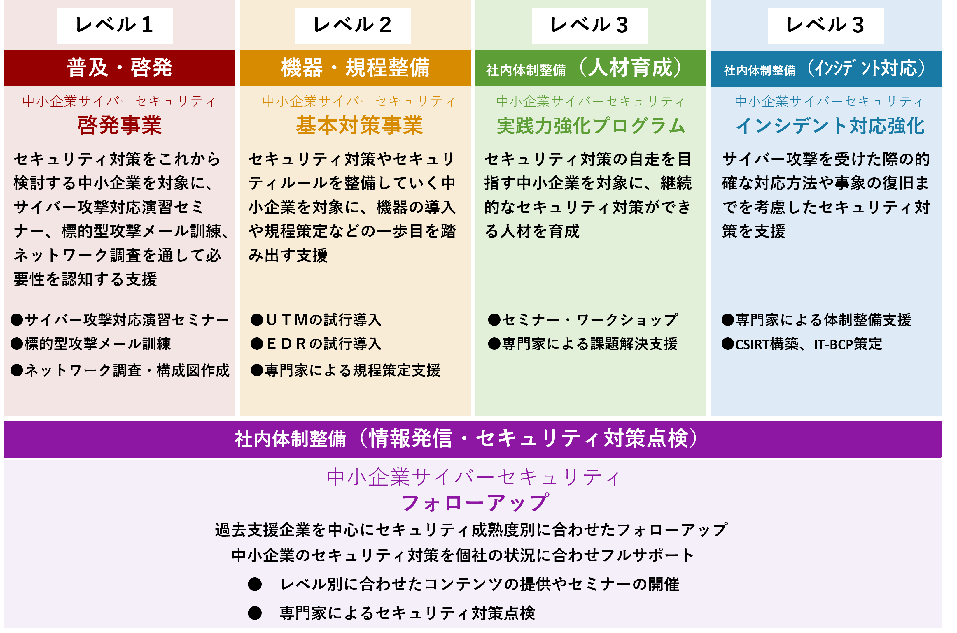 - 専門家派遣によるセキュリティ対策点検を行うことで定期的な見直しを支援しています。また、トークショー、ポータルサイト、メルマガ、セミナーを通じてセキュリティ情報の発信を行っています。